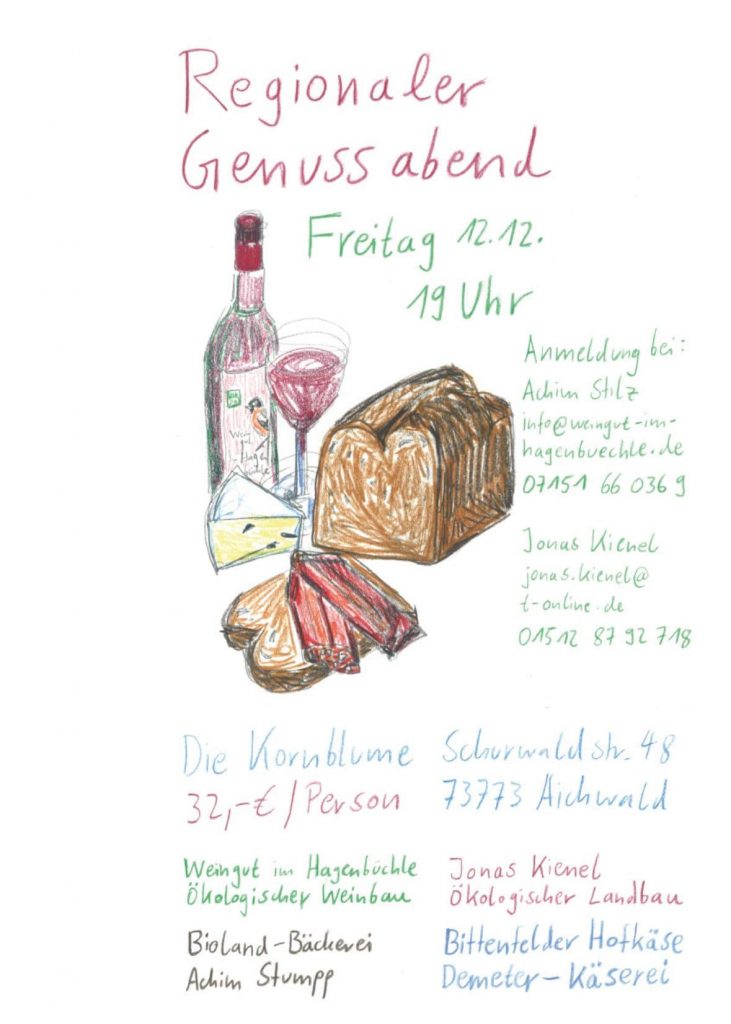 Die Früchte unserer Arbeit bieten wir Ihnen in der Kornblume an -stets frisch von Feld und Wiese. Was wir gerade nicht selber haben, beziehen wir von biologisch wirtschaftenden Kollegen in der Umgebung. Unser vielfältiges Angebot an Backwaren beziehen wir sowohl von der Bäckerei Berger in Plochingen, die für handwerkliche Backkunst sowie die Verwendung regionalen Getreides steht, als auch von der Bio-Baeckerei Stumpp in Deizisau (Bioland).